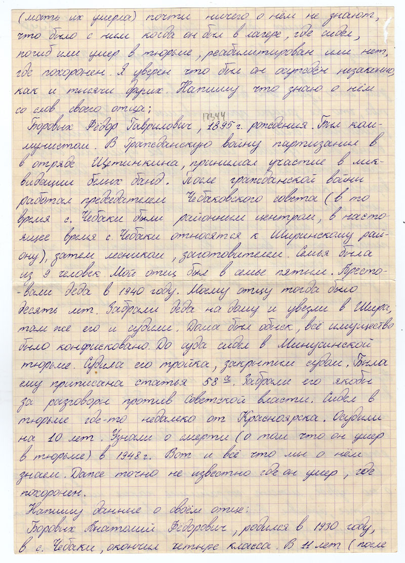 Боровых Федор Гаврилович, 1895 г. рождения. Был коммунистом. В Гражданскую войну партизанил в отряде Щетинкина, принимал участие в ликвидации белых банд. После гражданской войны работал Председателем Чебаковского совета (в то время с. Чебаки были районным центром, в настоящее время с. Чебаки относится к Ширинскому району), затем лесником, заготовителем. Семья была из 9 человек. Мой отец был в семье пятым. Арестовали деде в 1940 году. Моему отцу тогда было десять лет. Забрали деда на дому и увезли в Шира, там же его и судили. Дома был обыск, всё имущество было конфисковано. До суда сидел в Минусинской тюрьме. Судила его тройка, закрытым судом. Была ему приписана статья 58а. Забрали его якобы за разговоры против Советской власти. Сидел в тюрьме где-то недалеко от Красноярска. Осудили на 10 лет. Узнали о смерти (о том что он умер в тюрьме) в 1948 г. Вот и все что мы о нём знаем. Даже точно не известно где он умер, где похоронен.