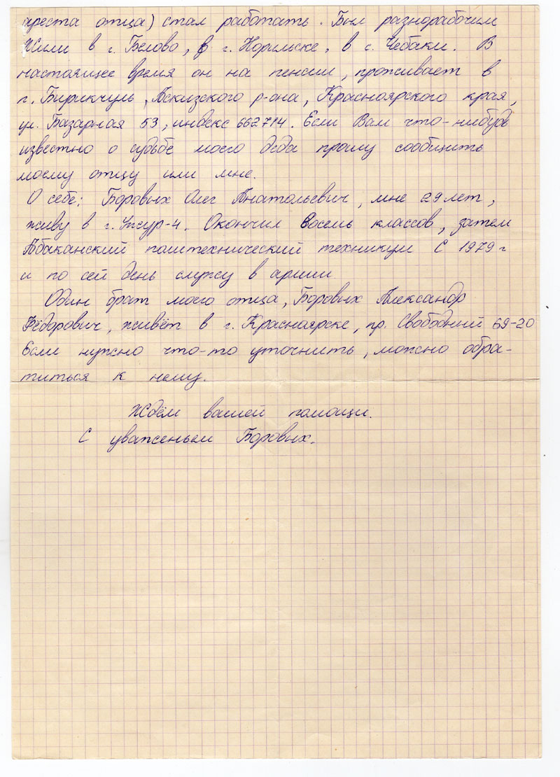 О себе: Боровых Олег Анатольевич, мне 29 лет, живу в г. Ужур-4. Окончил восемь классов, затем Абаканский политехнический техникум. С 1979 г и по сей день служу в армии.