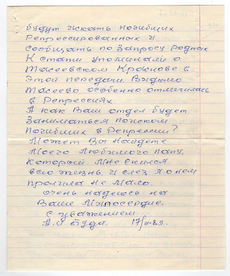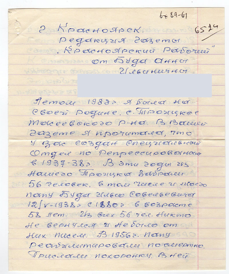 Летом 1988 г. я была на своей родине с. Троицкое Тасеевского р-на. В Вашей газете я прочитала, что у вас создан специальный Отдел по Репрессированным в 1937 – 38 г. В эти годы из нашего Троицка забрали 56 человек, в том числе и моего папу Буда Илью Савельевича 12/V – 1938 г. С 1880 г. в возрасте 58 лет. Из всех 56 человек никто не вернулся и не было от них писем. В 1956 г. папу реабилитировали посмертно. Прислали похоронку. В ней было написано, что Буда Илья Савельевич умер 1943 г. 7 января от упадка сердечной деятельности. Я не верю, что папа прожил пять лет, т.к. папа был больной. Болел он желудком. А при лагерном питании прожить 5 лет с больным желудком! Это невозможно. К тому-же в 1956 г. я ходли к Тасеевскому прокурору он мне ответил, что в августе м-це 1938 г. папа был расстрелено многими другими. А где эта экзекуция происходила он не сказал. Похоронку прислал Тасеевкий ЗАГС. Место смерти прочерк. Иркутское Радио организовала Утреннюю передачу «взгляд времени» где обнадеживают, что будут искать погибших Репрессированных и сообщать по запросу родных. Кстати упоминале о Тасеевском Краснове в этеой передачи. Видимо Тасеево особенно отличилась в Репрессиях.
