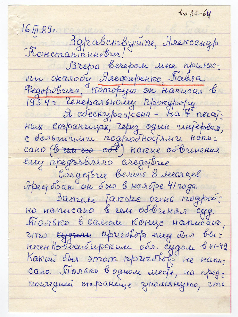 Вчера вечером мне принесли жалобу Алефиренко Павла Федоровича, которую он написал в 1954 г. Генеральному Прокурору.