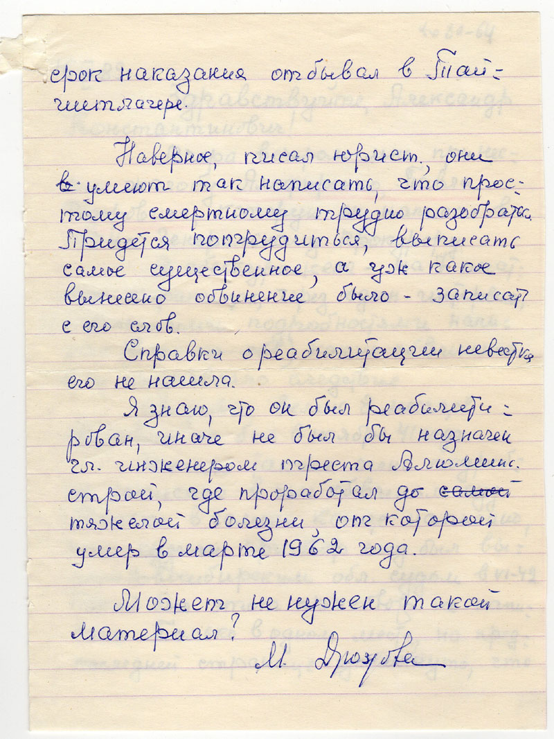 Я знаю, что он был реабилитирован, иначе не был бы назначен гл. инженером треста Алюминострой, где проработал до самой тяжелой болезни, от которой умер в марте 1962 года.