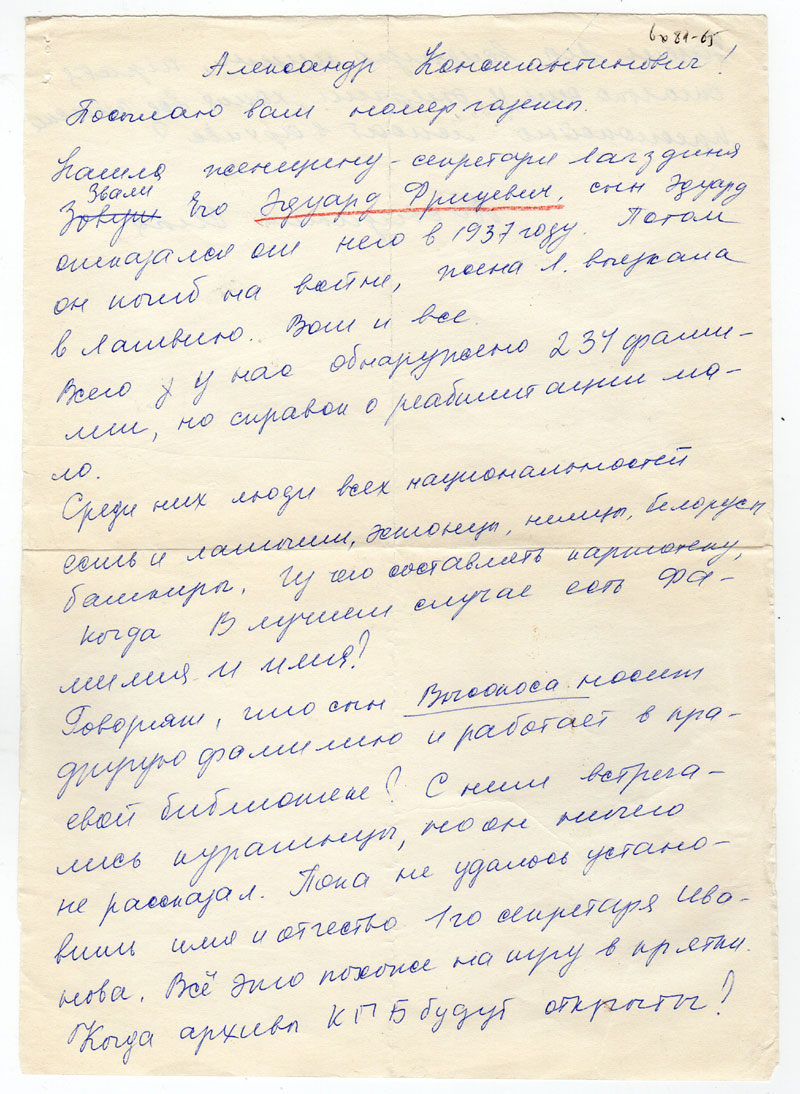 Говорят, что сын Высокоса носит другую фамилию и работает в краевой библиотеке? С ним встречались курагшцы, но он ничего не рассказал. Пока не удалось установить имя и отчество 1го секретаря Иванова. Всё это похоже на игру в прятки. Когда архивы КГБ будут открыты? Зачем мы вслепую ищем, тратя столько сил и энергии, хотя все списки преспокойно лежат в архиве?
