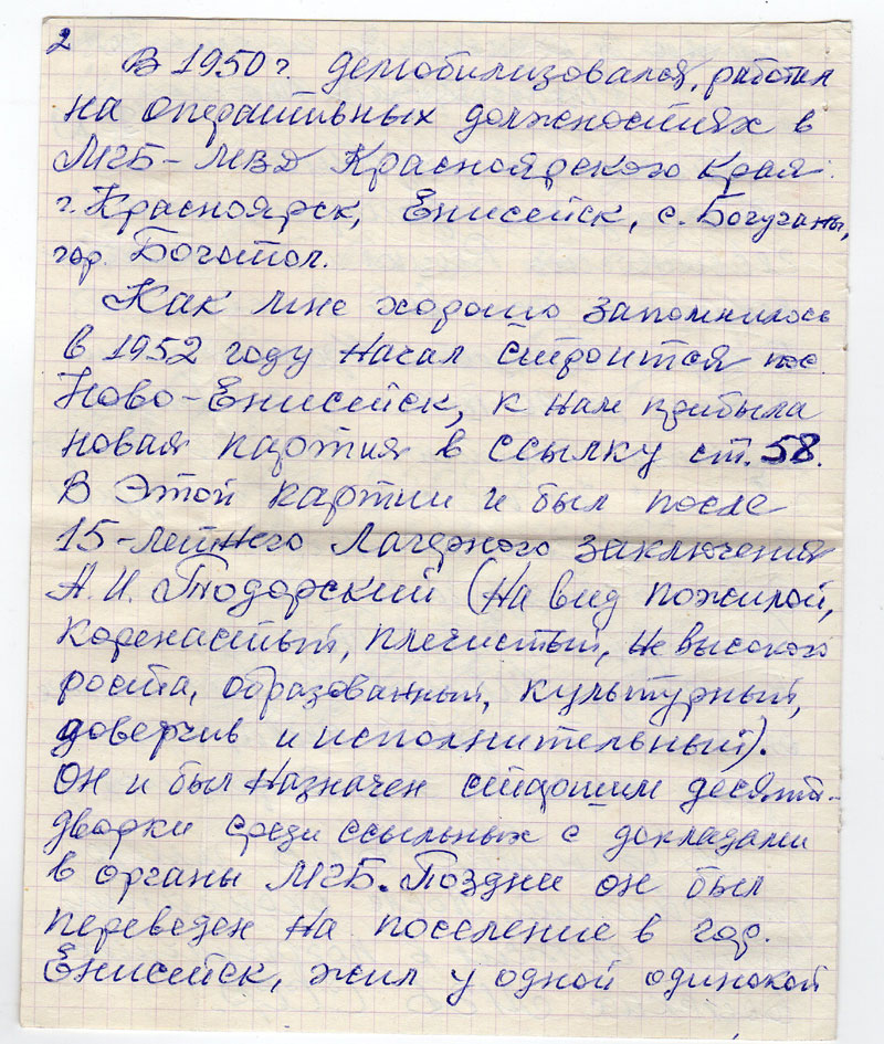 В 1950 г. демобилизовался, работал на оперативных должностях в МГБ - МВД Красноярского края (адрес).