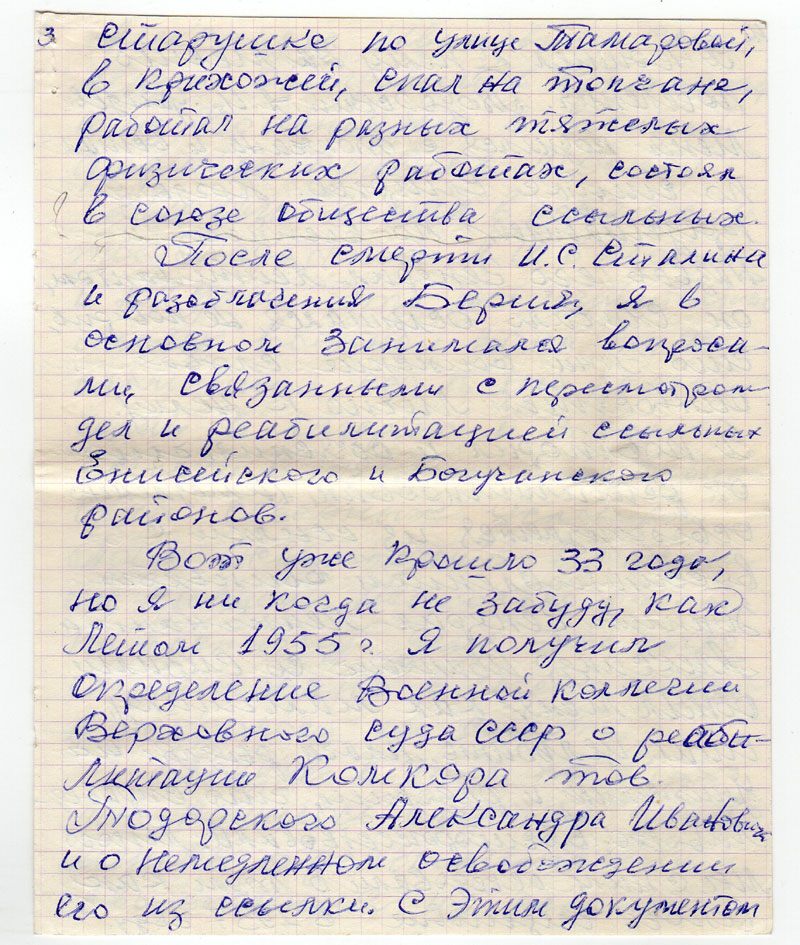 После смерти И.С. Сталина и разоблачения Берия, я в основном занимался вопросам, связанными с пересмотром дел и реабилитацией ссыльных Енисейского и Богучанского районов.