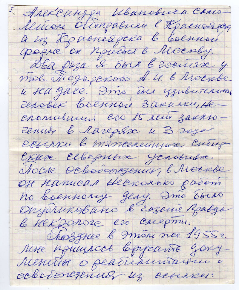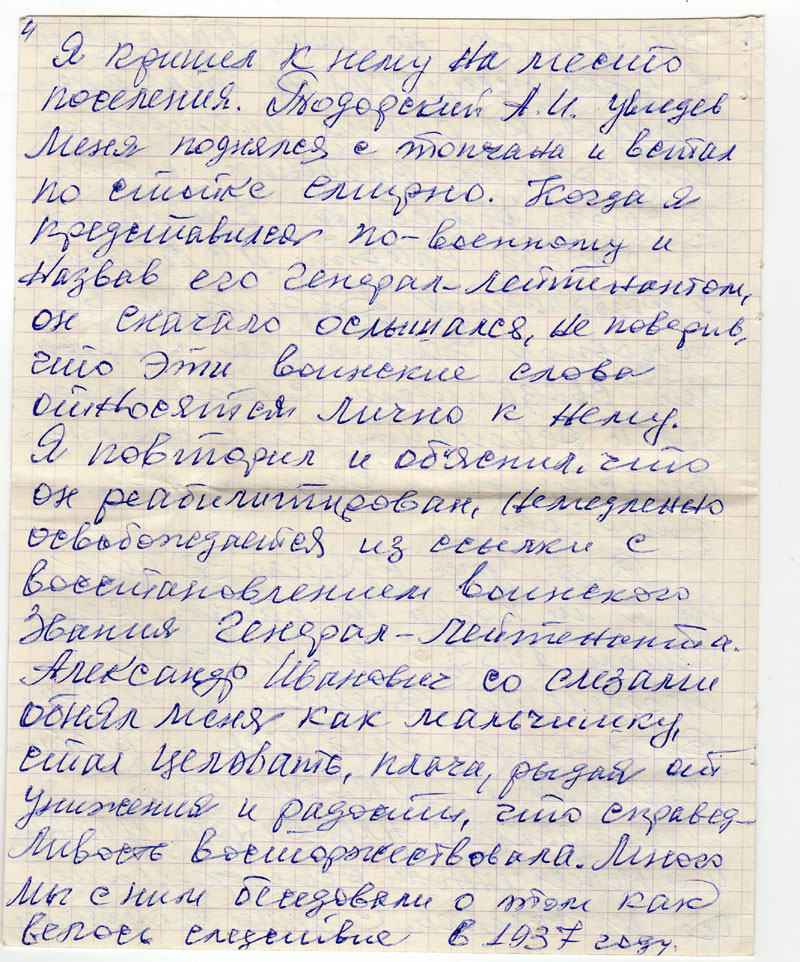 Вот уже прошло 33 года, но я ни когда не забуду, как летом 1955 г. я получил определение Военной коллегии Верховного суда СССР о реабилитации комкора тов. Тодорского Александра Ивановича и о немедленном освобождении его из ссылки. С этим документом я пришел к нему на место поселения. Тодорский А.И. увидев меня поднялся с топчана и встал по стойке смирно. Когда я представился по-военному и назвав его генерал-лейтенантом он сначало ослышался, не поверив, что эти воинские слова относятся лично к нему. Я повторил и объяснил, что он реабилитирован, немедленно освобождается из ссылки с восстановлением воинского звания генерал-лейтенанта. Александр Иванович со слезами обнял меня как мальчишку, стал целовать, плача, рыдая от унижения и радости, что справедливость восторжествовала. Много мы с ним беседовали о том как велось следствие в 1937 году.