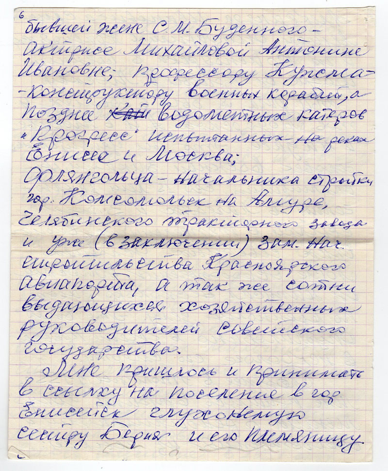 Позднее в этом же 1955 г. мне пришлось вручать документы о реабилитации и освобождения из ссылки: бывшей жене С.М. Буденного - актрисе Михайловой Антонине Ивановне; профессору Кужма - конструктору военных кораблей, а позднее кат водометных катеров «Прогресс» испытанных на реках Енисее и Москва;