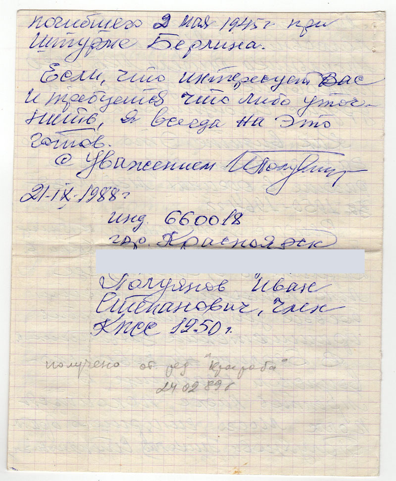 В Берлине на советско-воинском кладбище в Трептов парке покоится прах моего старшего брата Полуянова Николая Степановича, погибшего 2 мая 1945 г. при штурме Берлина.