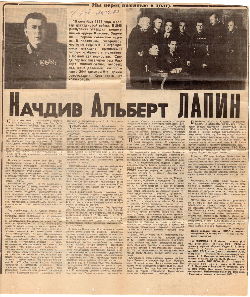 За выдающуюся роль в разгроме Колчака и интервентов она была награждена почетным революционным Красным знаменем, получила наименование «30-я Иркутская стрелковая дивизия». «За многочисленные подвиги в боях и продолжительную боевую деятельность» и «ранение в боях против неприятеля» от имени РВС РСФСР высокую награду – орден Красного Знамени вручили А. Я. Лапину. Шел ему тогда двадцать первый год.