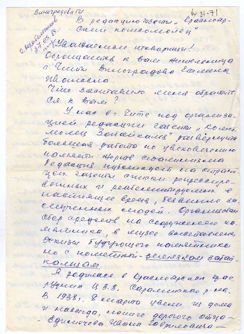 У нас в г. Чита под организацией редакции газеты «Комсомолец Забайкалья» развернута большая работа по увековечению памяти жертв сталинизма. Редакция публикует на страницах газеты списки репрессированных и реабелитируемых в настоящее время, безвинно замученных людей. Организован сбор средств на сооружение памятника, в музее выставлены эскизы будующего памятника но с пометкой – землякам забайкальцам.