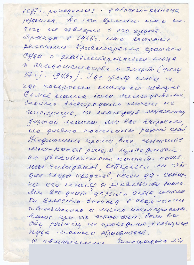 Я родилась в Красноярском крае рудник Ц.З.З. Саралинского р-на. В 1938 г. 8 марта увели из дома и навсегда, нашего дорогого отца – Едимечева Ивана Гавриловича – 1897 г. Рождения – рабочего-кузнеца рудника. До сего времени нам ничего не известно о его судьбе. Правда в 1956 г. Нам выслали решение Красноярского краевого суда о реабелитировании отца и свидетельство о смерти (умер 17 XI-1942 г.). Где умер отец и где похоронен ничего не известно. Семья наша была многодетная, сколько выстрадано ничем не измеришь, но благодаря мужеству дорогой мамы, мы все выросли, но давно покинули родной край. Убедительно прошу, Вас, сообщить мне – какая работа проводится по увековечению памяти погибших сибиряков, открыт ли счет для сбора средств, если да – сообщите его номер и реквизиты банка. Мы все дети дорогого отца, хотели бы внести вклад в сооружение памятника и лично поприсутствовать при его открытии. Если Вы эту работу не проводите, сообщите куда можно обратиться.