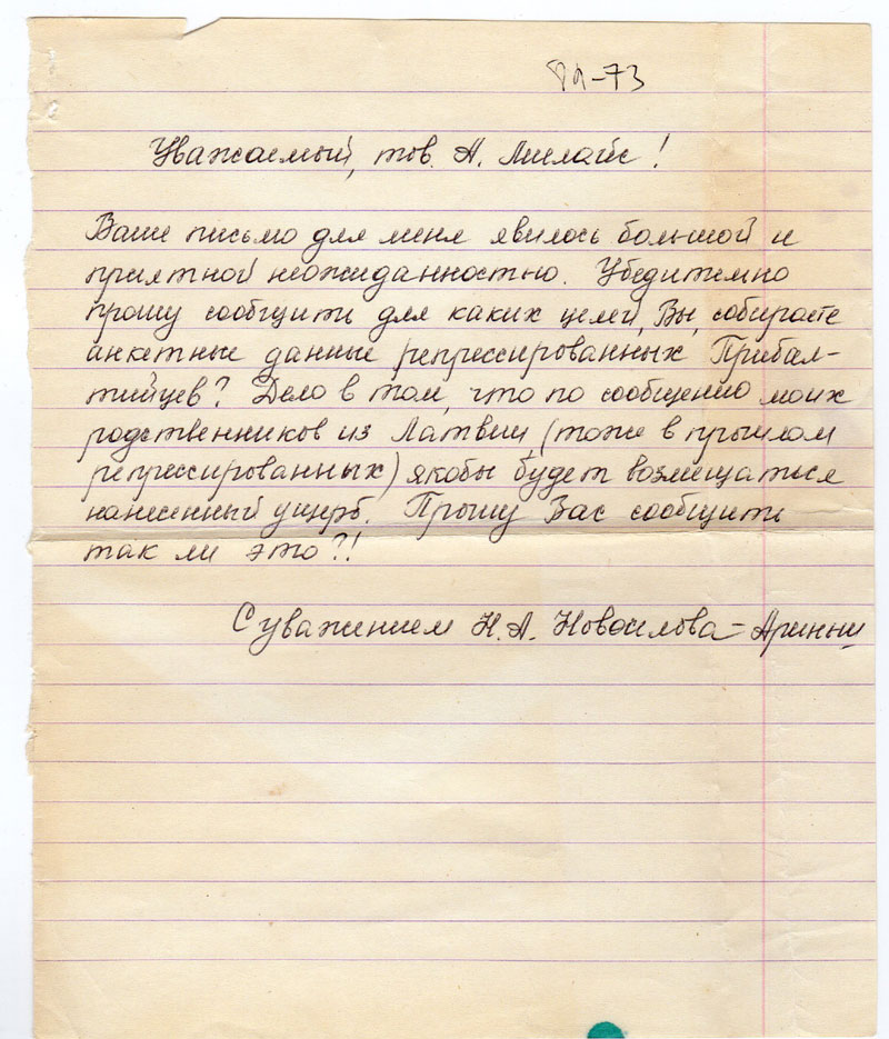 Ваше письмо для меня явилось большой и приятной неожиданностью. Убедительно прошу сообщить для каких целей, Вы, собираете анкетные данные репрессированных Прибалтийцев? Дело в том, что по сообщению моих родственников из Латвии, (тоже в прошлом репрессированных) якобы будет возмещаться нанесенный ущерб. Прошу Вас сообщить так ли это?!