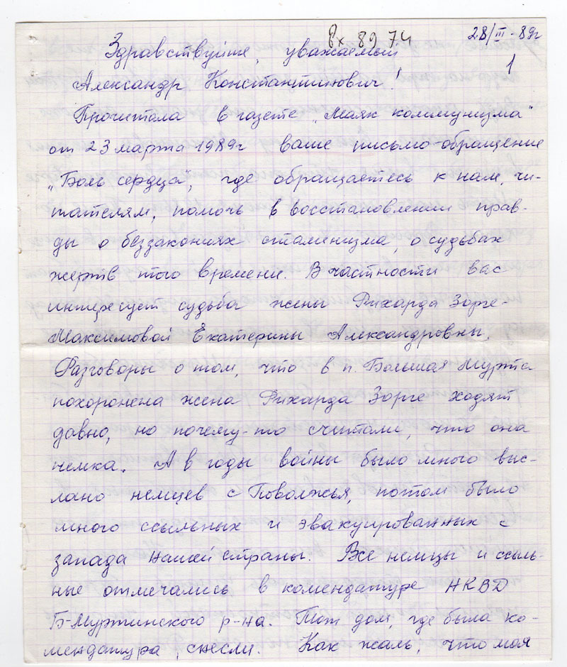 Прочитала в газете "Маяк коммунизма" от 23 марта 1989 г ваше письмо-обращение "Боль сердца", где обращаетесь к нам, читателям, помочь в восстановлении правды о беззакониях сталинизма, о судьбах жертв того времени. В частности вас интересует судьба жены Рихарда Зорге - Максимовой Екатерины Александровны. Разговоры о том, что в п.Большая Мурта похоронена жена Рихарда Зорге ходят давно, но почему-то считали, что она немка. А в годы войны было много выслано немцев с Поволжья, потом было много ссыльных и эвакуированных с запада нашей страны. Все немы и ссыльные отмечались в комендатуре НКВД Б-Муртинского р-на. Тот дом, где была комендатура, снесли. Как жаль, что моя мама не дожила до этого дня, или же года на три раньше зашел бы разговор об этом. Ведь многих ссыльных она знала. Возможно и знала Екатерину Максимову, не зная в то же время, что она жена Рихарда Зорге.