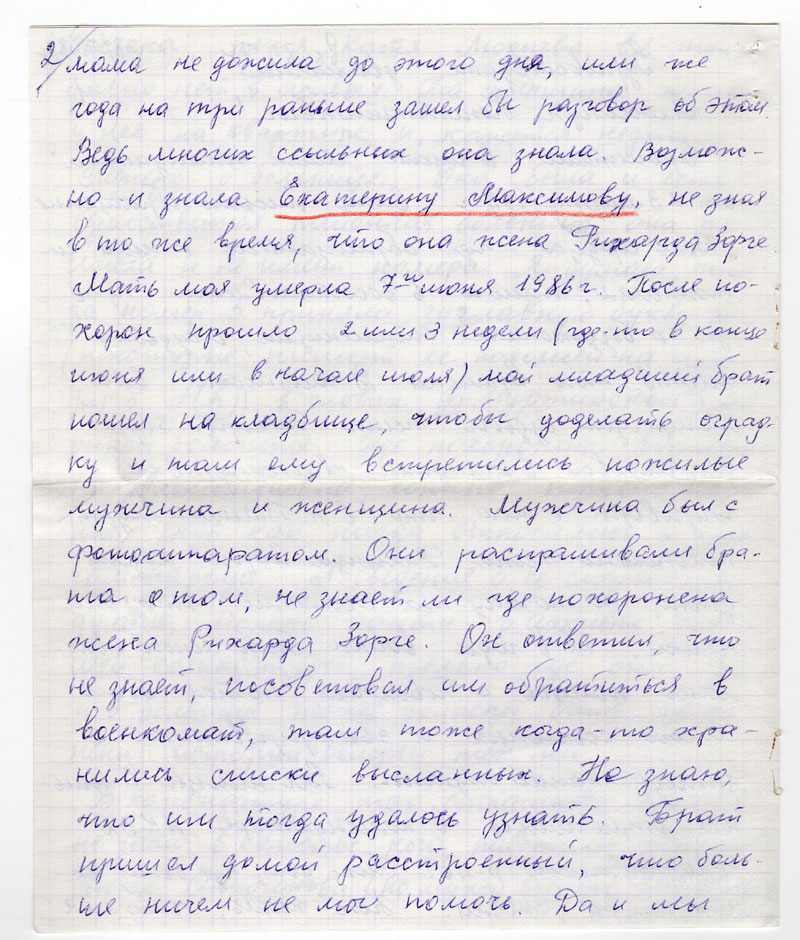 Мать моя умерла 7го июня 1986 г. После похорон прошло 2 или 3 недели (где-то в конце июня или в начале июля) мой младший брат пошел на кладбище, чтобы доделать оградку и там ему встретились пожилые мужчина и женщина. Мужчина был с фотоаппаратом. Они распрашивали брата о том, не знает ли где похоронена жена Рихарда Зорге. Он ответил, что не знает, посоветовал им обратиться в военкомат, там тоже когда-то хранились списки высланных. Не знаю, что им тогда удалось узнать. Брат пришел домой расстроенный, что больше ничем не мог помочь. Да и мы все (а нас 4 брата и 4 сестры) расстроились. Ведь мы все знаем кем был Рихард Зорге.