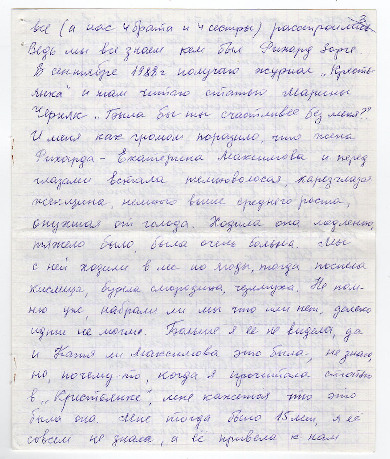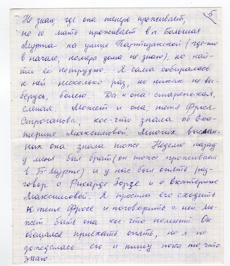 В комендатуре того страшного времени не знаю, в качестве кого, работала девушка Тоня Строгонова (по мужу теперь Михейкина). Не знаю, где она теперь проживает, но ее мать проживает в п. Большая Мурта на улице Партизанской (где-то в начале, номер дома не знаю), но найти ее нетрудно. Я сама собиралась к ней несколько раз, но никак не выберусь, болею. Да и она старенькая, слепая. Может и она, тетя Фрося Строганова, кое-что знала об Екатерине Максимовой. Многих высланных она знала тоже. Неделю назад у меня был брат ( он тоже проживает в Б-Мурте) и у нас был опять разговор о Рихарде Зорге и о Екатерине Максимовой. Я просила его сходить к тете Фросе и поговорить с ней. Может быть она кое-что помнит. Он обещался приехать опять, но я не дождалась его и пишу пока то, что знаю.