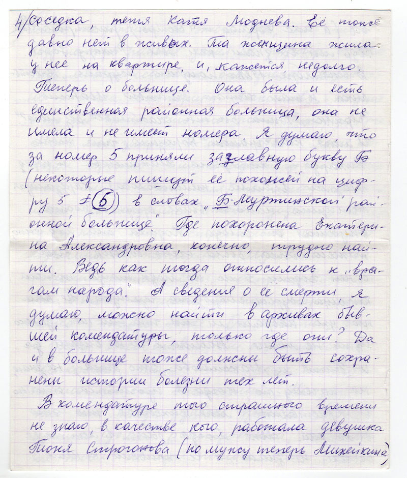 Теперь о больнице. Она была и есть единственная районная больница, она не имела и не имеет номера. Я думаю, что за номер 5 приняли Заглавную букву Б (некоторые пишут ее похожей на цифру 5) в словах "Б-Муртинской районной больнице". Где похоронена Екатерина Александровна, конечно, трудно найти. Ведь как тогда относились к "врагам народа". А сведения о ее смерти, я думаю, можно найти в архивах бывшей комендатуры, только где они? Да и в больнице тоже должны быть сохранены истории болезни тех лет.