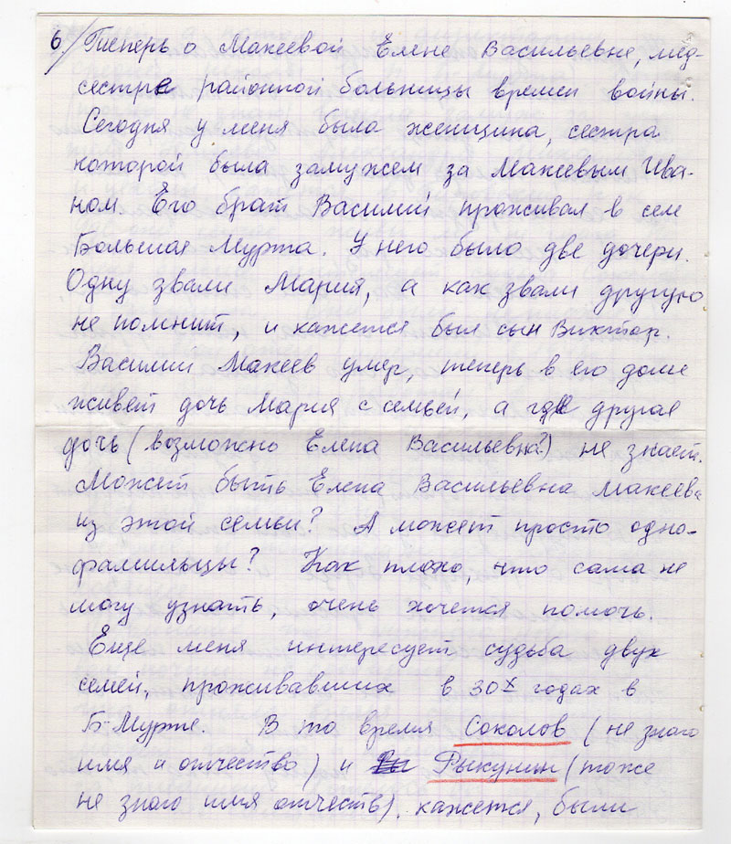 Теперь о Макеевой Елене Васильевне, медсестре районной больницы времен войны. Сегодня у меня была женщина, сестра которой была замужем за Макеевым Иваном. Его брат Василий проживал в селе Большая Мурта. У него было две дочери. Одну звали Мария, а как звали другую не помнит, и кажется был сын Виктор. Василий Макеев умер, теперь в его доме живет дочь Мария с семьей, а где другая дочь (возможно Елена Васильевна?) не знает. Может быть Елена Васильевна Макеева из этой семьи? А может просто однофамильцы? Как плохо, что сама не могу узнать, очень хочется помочь.