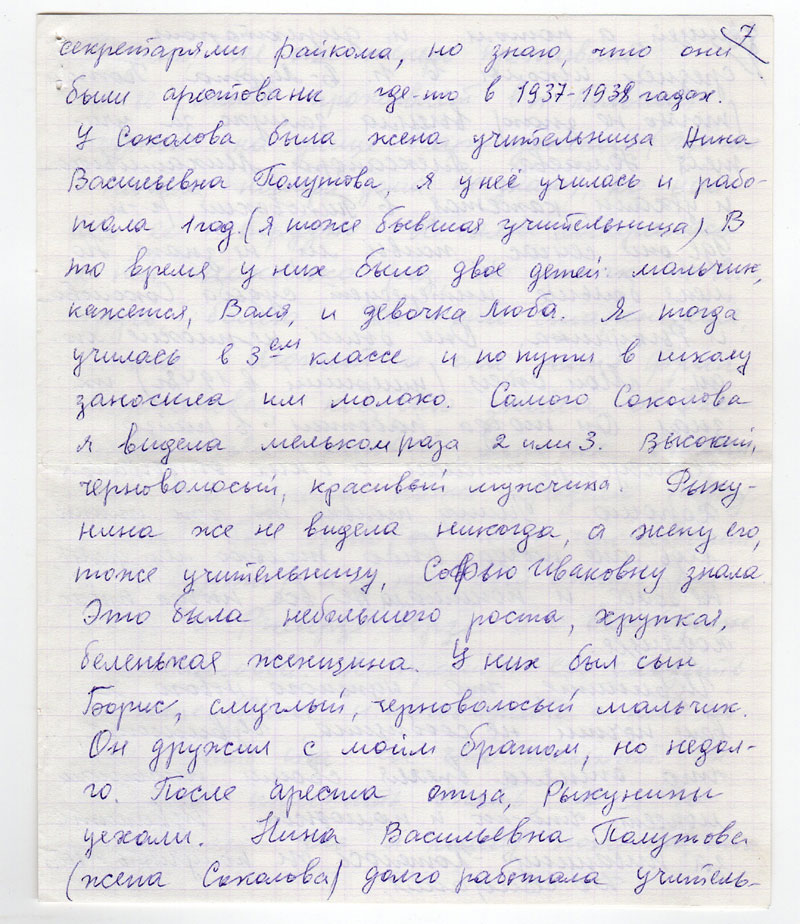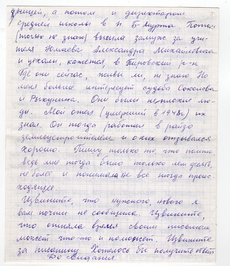 Еще меня интересует судьба двух семей, проживавших в 30х годах в Б-Мурте. В это время Соколов (не знаю имя и отчество) и Рыкунин (тоже не знаю имя отчеств), кажется, были секретарями райкома, но знаю, что они были арестованы где-то в 1937-1938 годах. У Соколова была жена учительница Нина Васильевна Полутова, я у нее училась и работала 1 года (я тоже бывшая учительница). В то время у них было двое детей: мальчик, кажется, Валя, и девочка Люба. Я тогда училась с 3ем классе и по пути в школу заносила им молоко. Самого Соколова я видела мельком раза 2 или 3. Высокий, черноволосый, красивый мужчина. Рыкунина же не видела никогда, а жену его, тоже учительницу, Софью Ивановну знала. Это была небольшого роста, хрупкая, беленькая женщина. У них был сын Борис, смуглый, черноволосый мальчик. Он дружи с моим братом, но недолго. После ареста отца, Рыкунины уехали. Нина Васильевна Полутова (жена Соколова) долго работала учительницей, а потом и директором средней школы в п. Б-Мурта. Потом (точно не знаю) вышла замуж за учителя Юмаева Александра Михайловича и уехали, кажется, в Пировский р-н. Где они сейчас, живы ли, не знаю. Но меня больше интересует судьба Соколова и Рыкунина. Они были неплохие люди. Мой отец (умерший в 1948 г) их знал. Он тогда работал в райзо землеустроителем и о них отзывался хорошо. Пишу только то, что помню, ведь мне тогда было только лет десять, не более и понимала не все тогда происходящее.