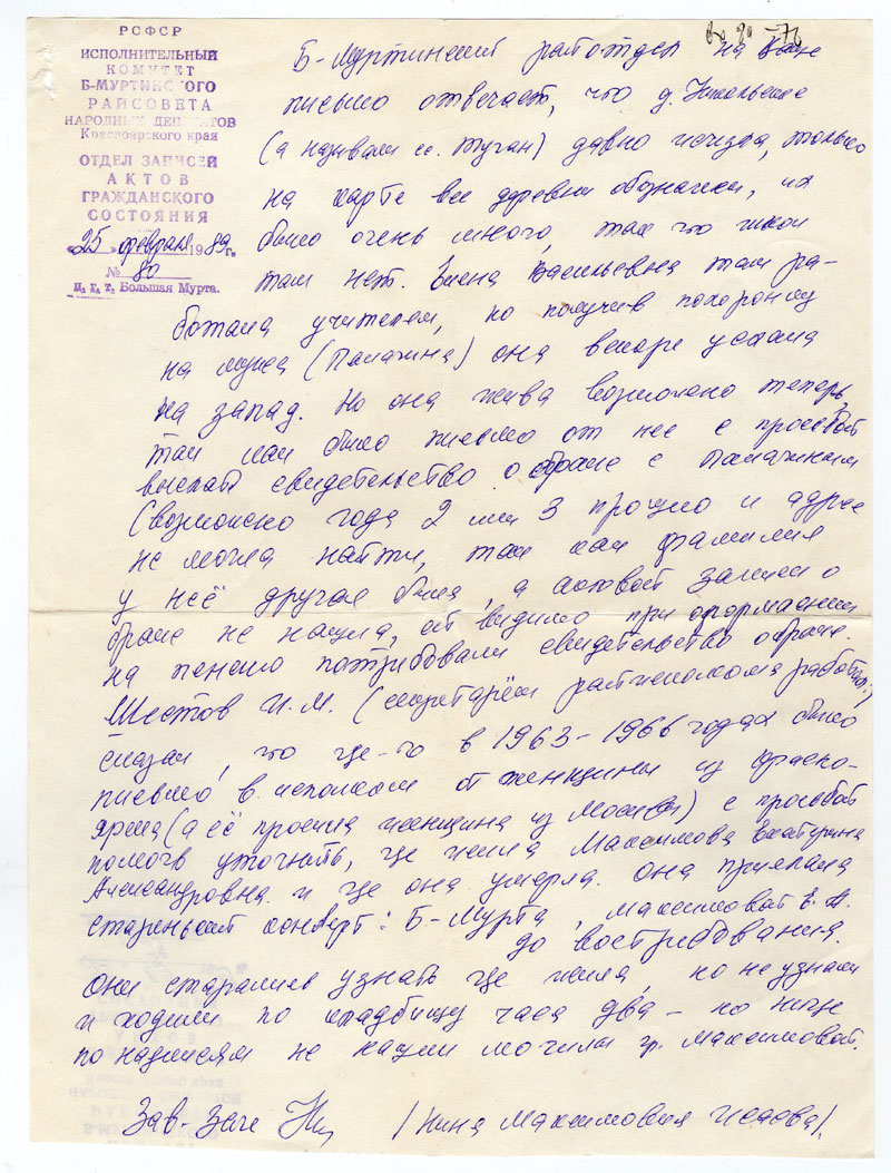 где она умерла. Она прислала старенький конверт: Б-Мурта, Максимовой Е.А. до