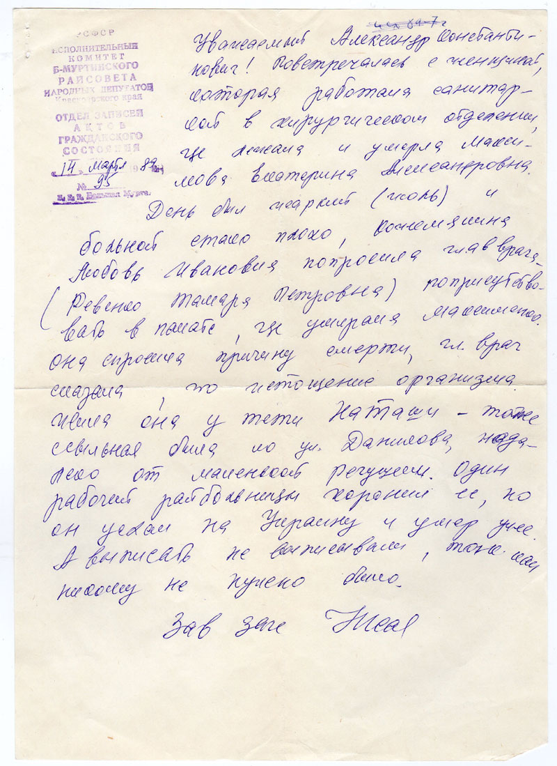 умирала Максименко. Она спросила причину смерти, гл. врач сказала, что истощение