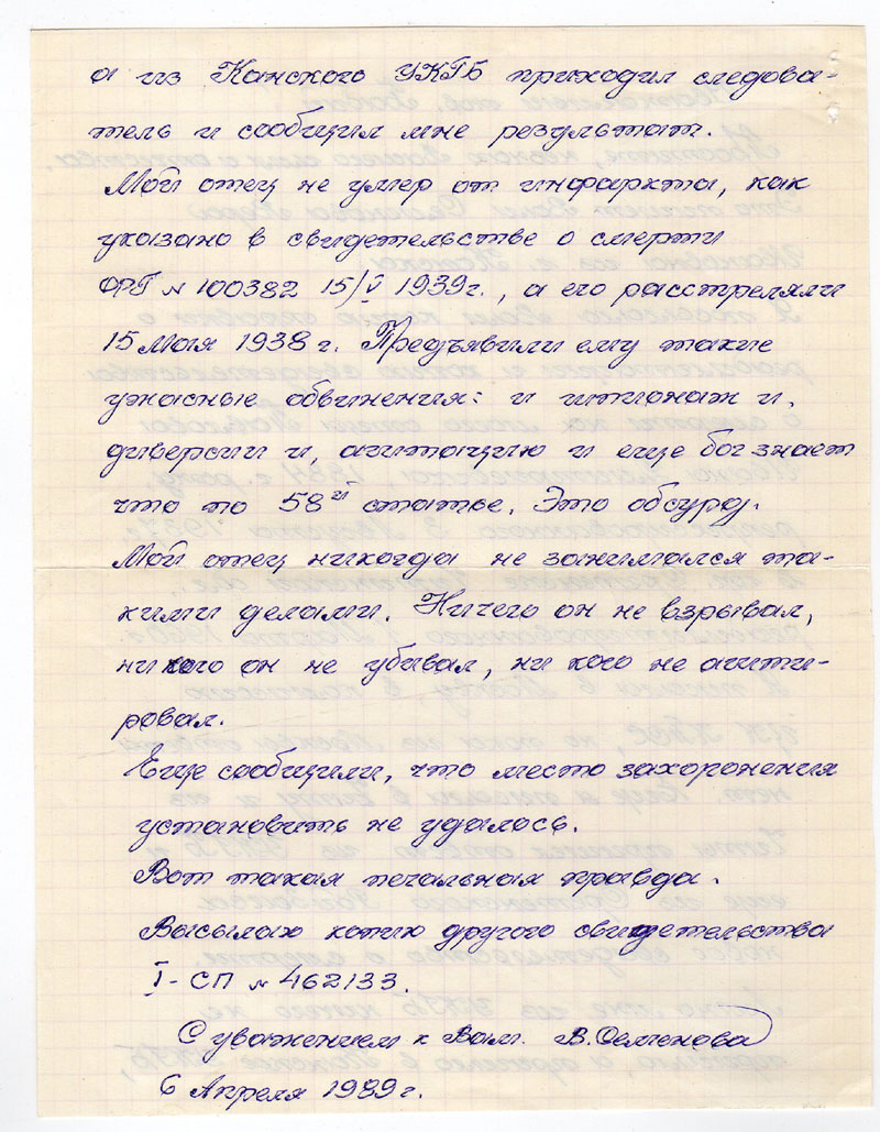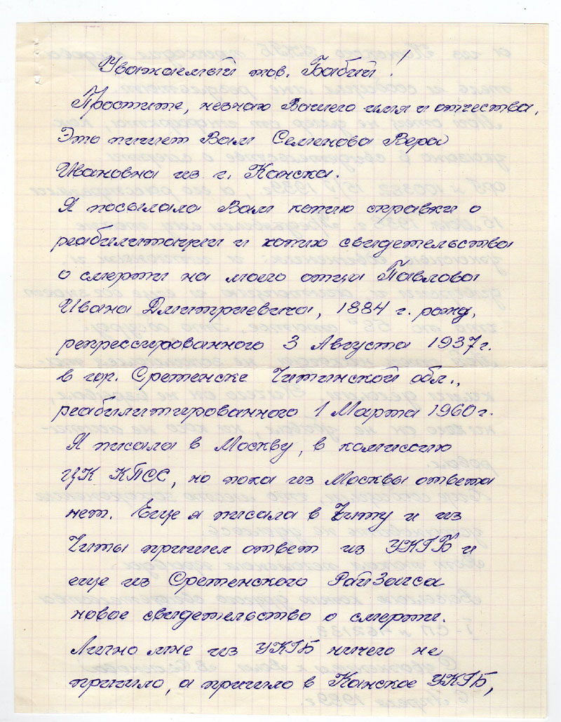 Я посылала Вам копию справки о реабилитации и копию свидетельства о смерти на моего отца Павлова Ивана Дмитриевича, 1884 г. рожд, репрессированного 3 августа 1937 г. в гор. Сретенске Читинской обл., реабилитированного 1 марта 1960 г. Я писала в Москву, в комиссию ЦК КПСС, но пока из Москвы ответа нет. Еще я писала в Читу и из Читы пришел ответ из УКГБ и еще из Сретенского РайЗагса новое свидетельство о смерти. Лично мне из УКГБ ничего не пришло, а пришло в Канское УКГБ, а из Канского УКГБ приходил следователь и сообщил мне результат. Мой отец не умер от инфаркта, как указано в свидетельстве о смерти ОРГ № 100382 15/V 1939 г., а его расстреляли 15 мая 1938 г. Предъявили ему такие ужасные обвинения: и шпионаж и, диверсии и, агитацию и еще бог знает что по 58 Й статье. Это обсурд. Мой отец никогда не занимался такими делами. Ничего он не взрывал, ни кого он не убивал, ни кого не агитировал.