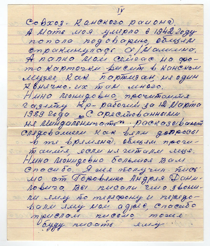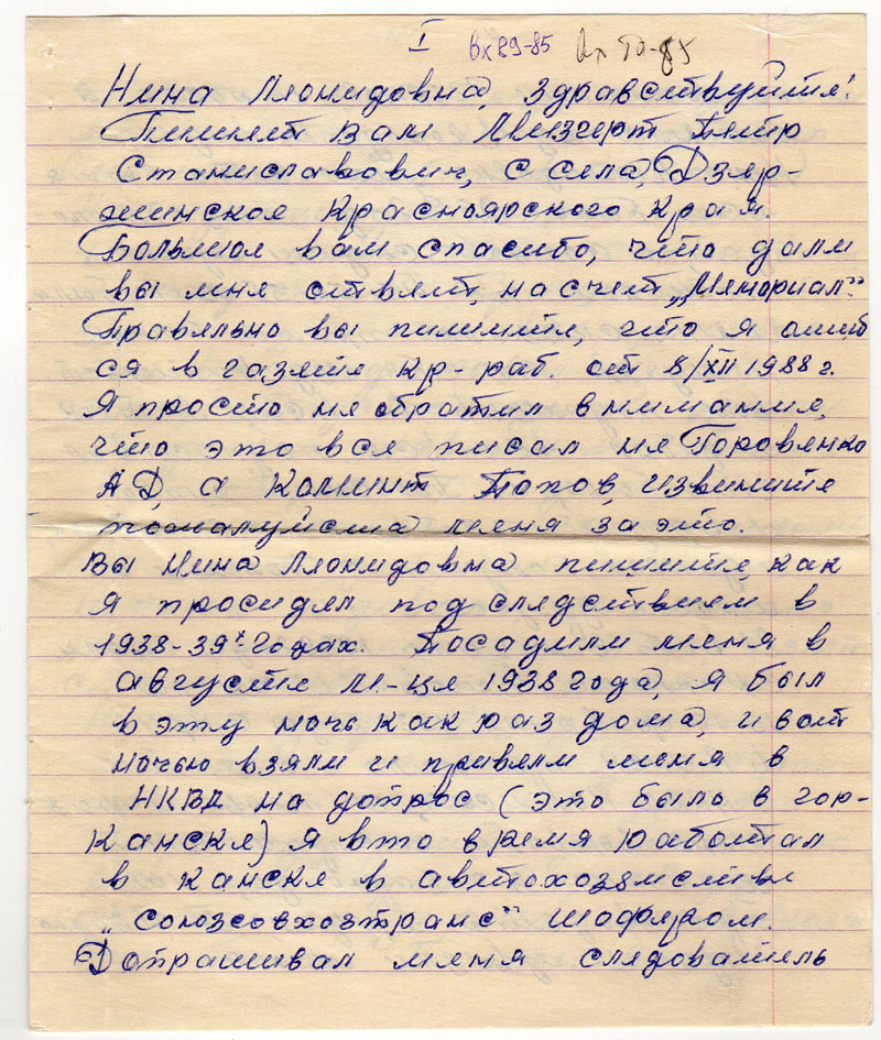 Пишет Вам Мизгерт Петр Станиславович, с села Дзержинское Красноярского края. Большое вам спасибо, что дали вы мне ответ, на счет «Мемориал». Правильно вы пишите, что я ошибся в газете Кр. раб. от 8/XII 1988 г. Я просто не обратил внимание, что это все писал не Горовенко АД, а Коммнт Попов, извините пожалуйста меня за это.