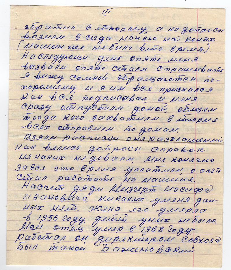 Насчет дяди Мизгерт Иосифа Ивановича, ни каких уменя данных нет. Жена его умерла в 1956 году, детей уних не было. Мой отец умер в 1968 году. Работал он директором совхоза. Был такой Баженовский совхоз. Канского раиона.