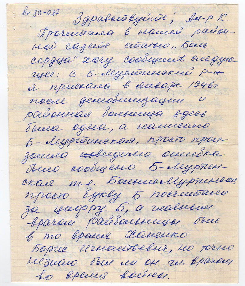 Прочитала в нашей районной газете статью «Боль сердца» хочу сообщить следующее: В Б-Муртинский р-н я приехала в январе 1946г после демобилизации и районная больница здесь была одна, а написано 5-Муртинская, просто произошла повидимо ошибка было сообщено Б-Муртинская т.е. Больше-Муртинская просто букву Б посчитали за цифру 5, а главным врачом райбольницы был в то время Ханенко Борис Игнатьевич, но точно незнаю был ли он гл. врачом во время войны.