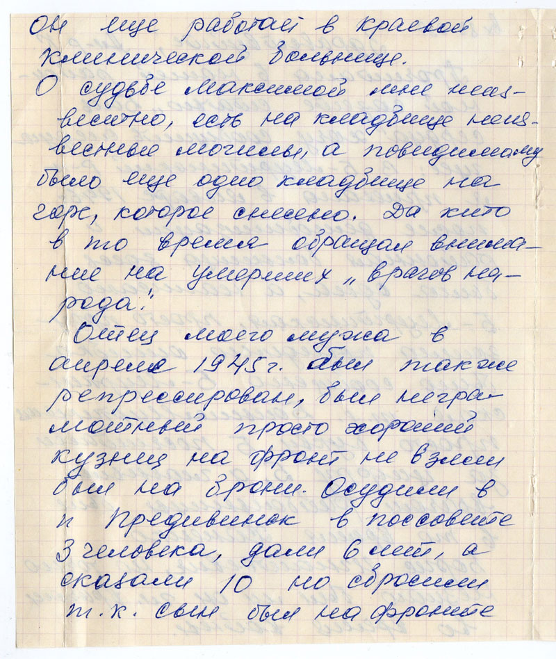 О судьбе Максимовой мне неизвестно, есть на кладбище неизвестные могилы, а повидимому было еще одно кладбище на горе, которое снесено. Да кто в то время обращал внимание на умерших «врагов народа».