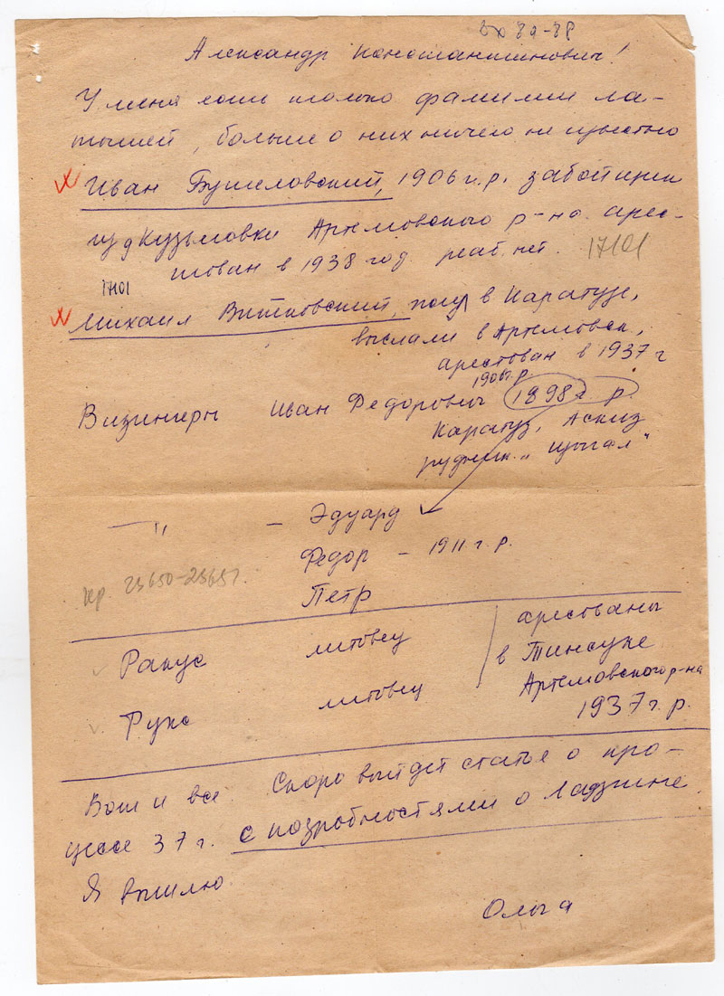 Михаил Витковский (Витовский - ред. сайта), жил в Каратузе, выслали в Артемовск, арестован в 1937 г. 1906 г.р.