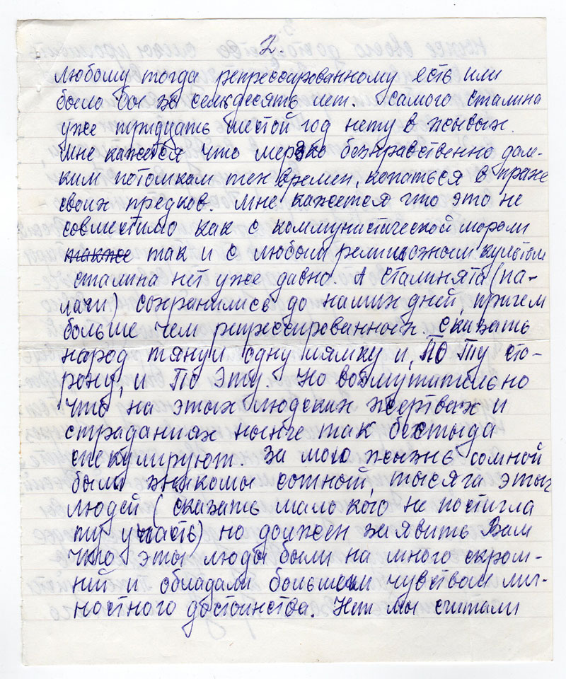 Любому тогда репрессированному есть или было бы за семьдесят лет. Самого Сталина уже тридцать шестой год нету в жывых. Мне кажется что мерзко безнравственно далеким потомкам тех времен, копаться в прахе своих предков. Мне кажется что это не совместимо как с коммунистической морали также так и с любым религиозным культом Сталина нет уже давно. А сталинята (палачи) сохранились до наших дней, причем больше чем репрессированных. Сказать народ тянул одну лямку и по ту сторону, и по эту. Но возмутительно что на этых людских жертвах и страданиях нынче так бестыда спекулируют. За мою жызнь сомной были знакомы сотный, тысячи этых людей (сказать мало кого не постигла ту участь) но должен заявить Вам что эты люды были на много скромней и обладали большим чувством личностного достоинства. Нет мы считали ныже своего достойнства слезы проливать и сопливыть. Вы в нацтоящем во много крат обожли прежных антисоветчиков контреволюцию. Мне очень удивляет кто вы? Вас обыжали в войну с гитлером, вы сохранились. Вас репресировал Сталин вы целые невредимые. После Сталина оголилась вся черн Нечерноземная зона России изчезают почты полности Аборигены Сибиры Дальнего востака народности Севера. Изчезает вековая природа нашей страны. Давно уже не выжу перелетных птыц (Гусей уток, лебедей таже белый и бурый медведь изчезает из природы если не считать «Красную книгу. Вас полста лет назад родственники не принимали выкидывали на мороз а вы выжили и нынче вы рекомендуете себе «заступникамы многострадальной Россий»