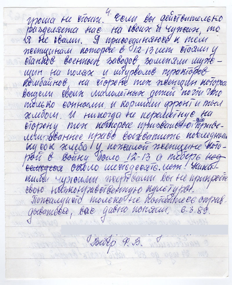 Ни как не могу осмыслить кто-же вы всеже такие, междулюдье, междуродье меж Посредники между крупнейших в мире национальных культур. Пожалуйста остепенитесь. Ваша правда ломонного гроша не стоит. Если вы действительно разделяета нас на своих и чужих, то я не свами. Я присоединяюсь к тем женщинам которые в 12-13 лет стояли у станков военных заводов, заменяли мужщин на полях и штурвалов тракторов комбайнов, на стороне тех женщин которые выдели своих малалетных детей почти что только сонными, и кормили фронт и тыл хлебом. И никогда не переметнус на сторону тех которые призваивают себе привелегированное право выхватить последный кусок хлеба у пожилой женщине которой в войну было 12-13 а теберь под семьдеся около шестьдесять. лет. Никакими чужими жертвами вы не прикроете свою низконравственную культуры.