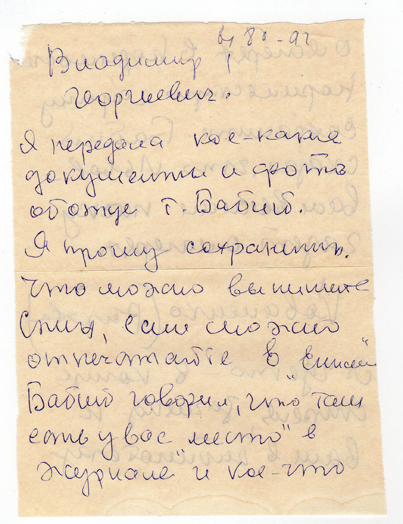 Стих, если можно отпечатайте в «Енисеи» Бабий говорил, что там есть у вас «место» в журнале и кое-что о лагерях в Норильске