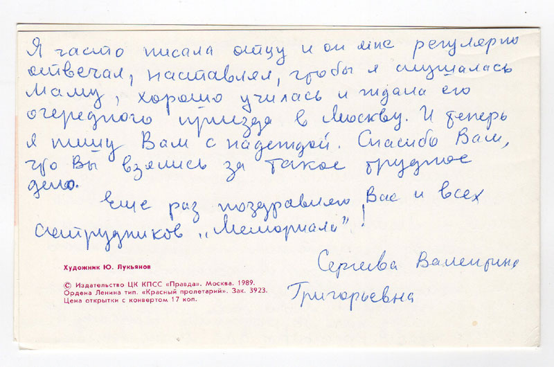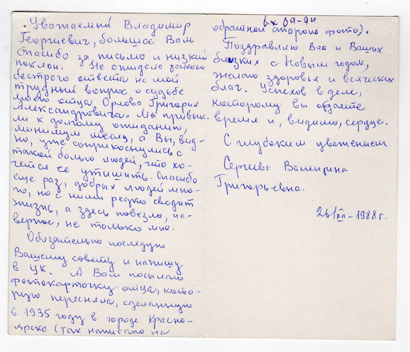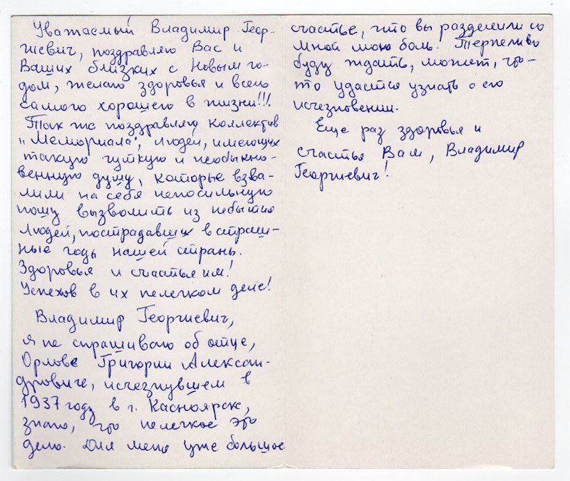 Владимир Георгиевич, поздравляю Ваш коллектив, Ваших сподвижников по благородным и так нужным нам всем делам – «Мемориал». Не спрашиваю о каких-либо результатах по розыску моего отца – Орлова Григория Александровича – это дело непростое. Но уже одно то, что Вы поняли и приняли мою боль, мне так дорого. Я пишу как бы родному человеку и как в детстве город Красноярск для меня близок. Я часто писала отцу и он мне регулярно отвечал, наставлял, чтобы я слушалась маму, хорошо училась и ждала его очередного приезда в Москву. И теперь я пишу Вам с надеждой. Спасибо Вам, что Вы взялись за такое трудное дело.