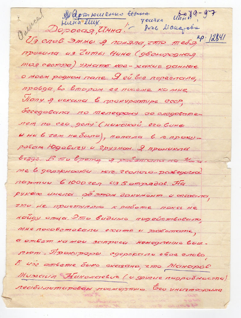 втором ее письме ко мне. Папу я искала в прокуратуре СССР, беседовала по