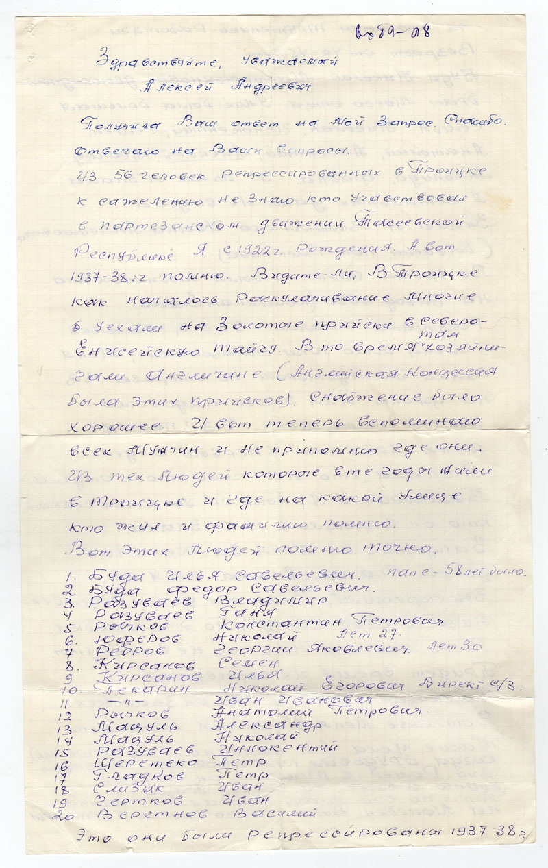 Из 56 человек репрессированных в Троицке к сажелению не знаю кто участвовал в партезанском движении Тосеевской Распублике. Я с 1922г. рождения. А вот 1937-1938гг помню. Видите-ли, в Троицке как началось раскулачивание многие уехали на Золотые прийски в северо-Енисейскую Тайгу. В то время там хозяйничали англичане (Английская концессия была этих прийсков). Снабжение было хорошее. И вот теперь вспоминаю всех мужчин и не припомню где они. Из тех людей которые в те годы жили в Троицке и где на какой улице кто жил и фамилию помню.