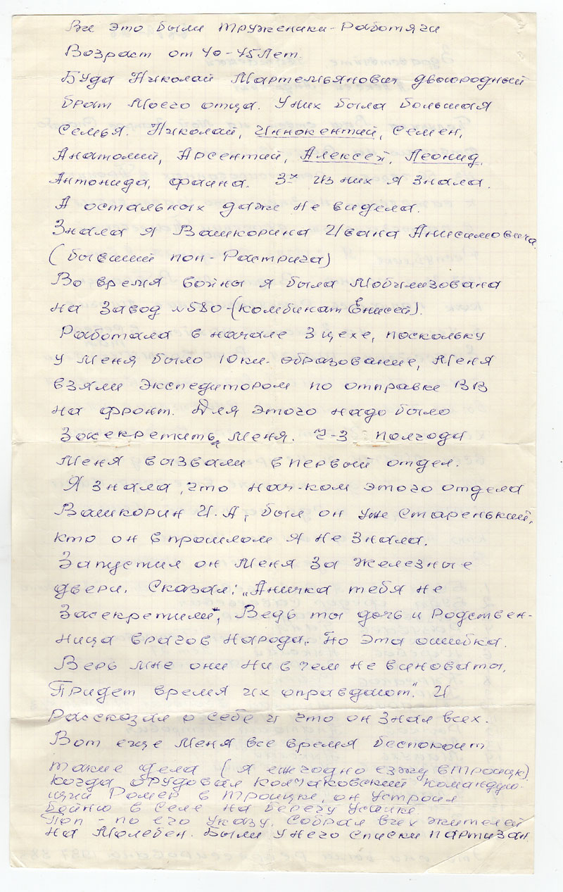 Работала в начале 3 цехе, поскольку у меня было 10кл. образование, меня взяли экспедитором по отправке ВВ на фронт. Для этого надо было засекретить меня. Ч-з полгода меня вызвали в первый отдел. Я знала, что нач-ком этого отдела Вашкорин И.А., был он уже старенький, кто он в прошлом я не знала. Запустил он меня за железные двери. Сказал: «Аничка тебя не засекретили, ведь ты дочь и родственница врагов народа, но это ошибка. Верь мне они ни в чем не виноваты. Придет время их оправдают». И рассказал о себе и что он знал всех.