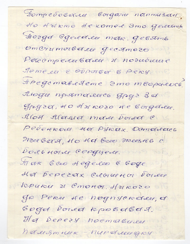 Потребовали выдачи партизан. Но никто не хотел это делать. Тогда сделали так, девять отсчитывали десятого расстреливали и погибшие летели с обрыва в реку. Представляете что творилось? Люди прятались друг за друга, но никого не выдали.