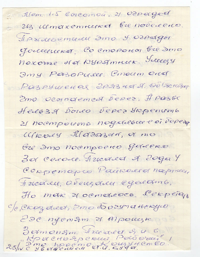 Так всю неделю в воде на берегах слышны были крики и стоны. Никого до реки не подпускали, а вода была кровавая. На берегу поставили памятник-пирамидку мет. 1,5 высотой. И оградка из штахетника все побелено. Примостили это у ограды домишка. Со стороны все это похоже на курятник. Улицу эту разорили. Стоит она разрушенная грязная. Об’ясняют что осыпается берег. А разве нельзя было берег укрепить и построить подальше от берега Школу Магазин, а том все это построено далеко за селом. Писала я года 4 Секретарю Райкома партии. Писали, обещали сделать, но так и осталось. Секретарь с/с, сказала, что Богучанскую ГЭС пустят и Троицк затопят. Писала я и в «Красноярский Рабочий». Это просто кощунство!