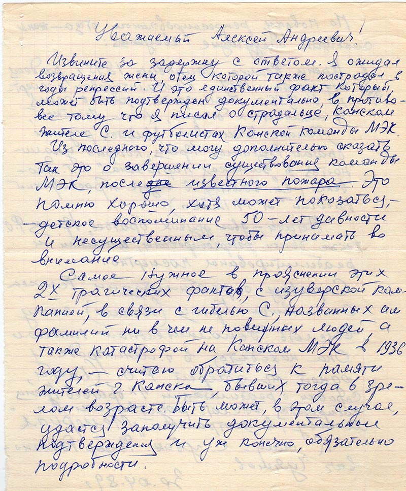 Извините за задержку с ответом. Я ожидал возвращения жены, отец которой также пострадал в годы репрессий. И это единственный факт который, может быть подтвержден документально, в противовес тому что я писал о страдальце, Канском жителе С. и футболистах Канской команды МЭК.