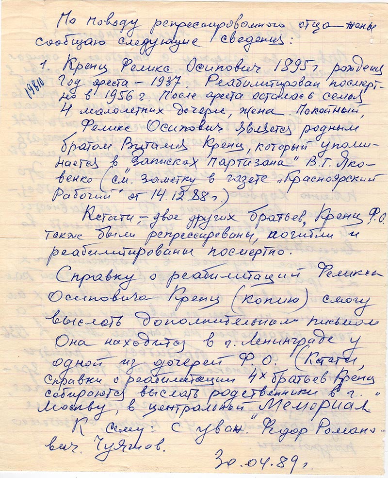 Справку о реабилитаций Феликса Осиповича Кренц (копию) смогу выслать дополнительным письмом Она находится в г. Ленинграде у одной из дочерей Ф.О. (Кстати, справки о реабилитации 4х братьев Кренц собираются выслать родственники в г. Москву, в центральный «Мемориал».
