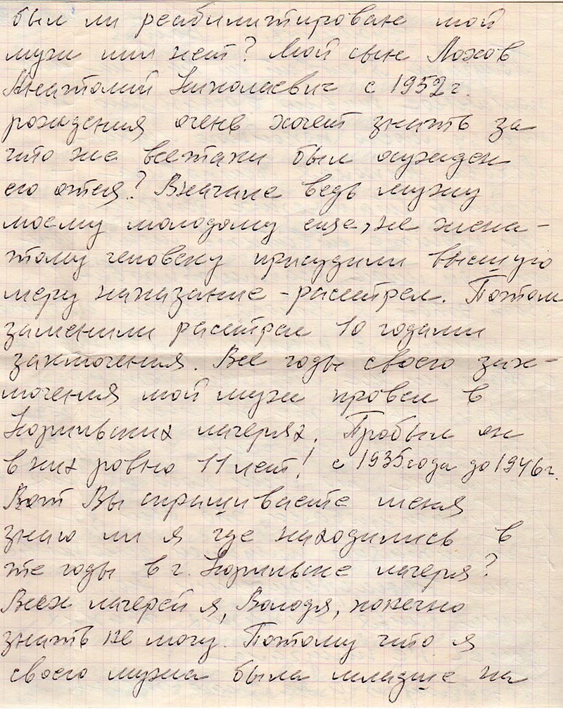Поэтому я и не знаю точно был ли реабилитирован мой муж или нет? Мой сын Лохов Анатолий Николаевич с 1952 г. рождения очень хочет знать за что же всетаки был осужден его отец? Вначале ведь мужу моему молодому еще, не женатому человеку присудили высшую меру наказание - расстрел. Потом заменили расстрел 10 годами заключения. Все годы своего заключения мой муж провел в Норильских лагерях. Пробыл он в них ровно 11 лет! с 1935 года до 1946 г.