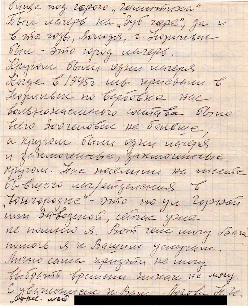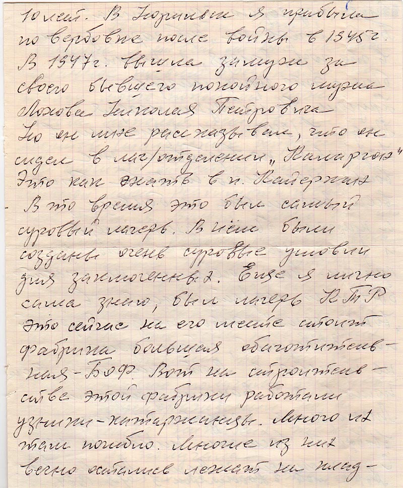 Вот вы спрашиваете меня знаю ли я где находились в те годы в г. Норильске лагеря? Всех лагерей я, Володя, конечно знать не могу. Потому что я своего мужа была младше на 10 лет. В Норильск я прибыла по вербовке после войны в 1945 г. В 1947 г. вышла замуж за своего бывшего покойного мужа Лохова Николая Петровича. Но он мне рассказывал, что он сидел в лаг/отделении «Каларгон». Это как знать в п. Кайеркан. В то время это был самый суровый лагерь. В нем были созданы очень суровые условии для заключенных. Еще я лично сама знаю, был лагерь КТР это сейчас на его месте стоит фабрика большая обаготительная - БОФ. Вот на строительстве этой фабрики работали узники-катаржанцы. Много их там погибло. Многие из них вечно остались лежат на кладбище под горою «Шмитиха» Был лагерь на «Зуб-горе», да и в те годы, Володя, г. Норильск был - это город лагерь. Кругом были одни лагеря. Когда в 1945г. мы приехали в Норильск по вербовке нас вольнонаемного состава было всего 300 человек не больше, а кругом были одни лагеря и заключенные, заключенные кругом. Нас поселили на месте бывшего лаг/отделения в «Юнгородке» - это по ул. Горной или Заводской, сейчас уже не помню я. Вот чем могу Вам помочь я к Вашим услугам. Лично сама придти не могу выбрать времени никак не могу.