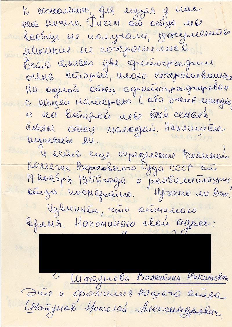 К сожалению, для музея у нас нет ничего. Писем от отца мы вообще не получали, документы никакие не сохранились. Если только две фотографии очень старые, плохо сохранившиеся. На одной отец сфотографирован с нашей матерью (оба очень молодые), а на второй мы всей семьей, тоже отец молодой. Напишите нужны ли.