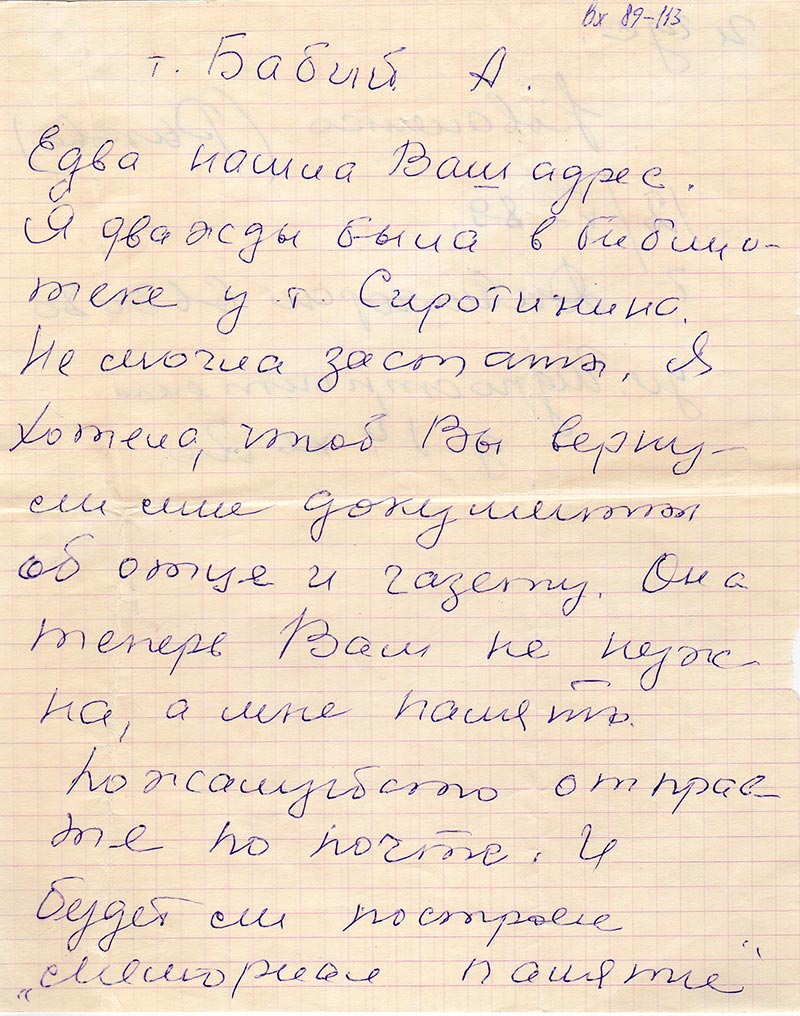 Едва нашла Ваш адрес. Я дважды была в библиотеке у т. Сиротинина. Не могла застать. Я хотела, чтоб Вы вернули мне документы об отце и газету. Она теперь Вам не нужна, а мне память.