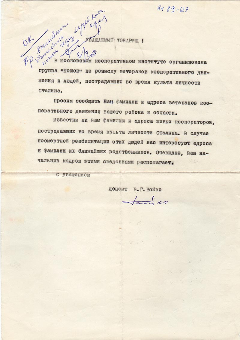 Просим сообщить нам фамилии и адреса ветеранов кооперативного движения Вашего