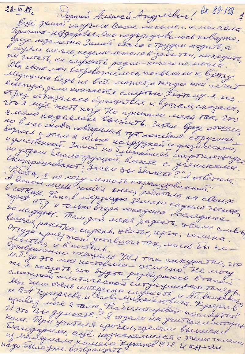 Ещё зимой получила Ваше письмо. И молчала. Причина – нездоровье. Зимой стала с трудом ходить, а в апреле слегла, неделю летала в забытьи, ни ходить, ни читать, ни слушать радио – ничего не могла.