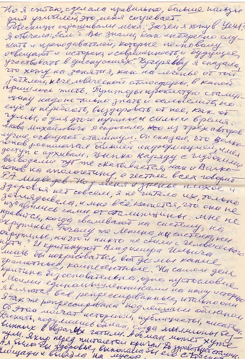 Я отвечала «Если б Вы знали, как интересно слушать и преподавателей, которые по-новому освещают и историю, и современность, и будущее, участвовать в дискуссиях: «Кучеряеву я сказала, что хожу на занятия, как на леченье от той затхлой, нечеловеческой атмосферы, в какой пришлось жить. Трижды проклятую сталинщину надо не только знать и осмыслить, но ещё и переболеть, выздороветь от неё, как от чумы, а для этого нужны и силы и время.