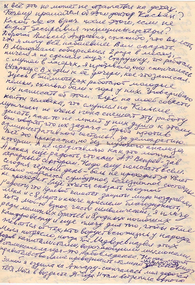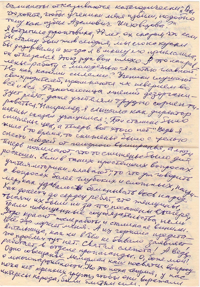 -Но как, какими силами? Ученики слушают своих родителей, проникаются их неверием во всё и вся. Разноголосица мнений дезорганизует ребят, даже учителям трудно сориентироваться. Например, я слышала как директор школы сказал учащимся: «При Сталине было сниженье цен, а теперь вот этого нет.» Ведь я жила в то время, то снижение было целью спасти людей от голодного вымиранья, а люди теперь понимают, что то сниженье было для роскоши. Если в таких простейших вопросах учителя истории «плавают», то что уж говорить о вопросах более глубоких и сложных, например, как удавалось обманывать весь народ. Как донести до сердец ребят, что женщины, тысячи их были ни за что посажены в лагеря, брали повышенные соцобязательства, пели «Утро красит» после работы и Сталина не винили. Всё это мучает меня. А из Горкома представительница, как ни в чём не бывало заявляет, что проблем тут нет. Святая слепота! А ведь работает в отделе пропаганды. О, боже мой! Одно совещанье Мемориал наш посвятил вопросу о многопартийности. Но это пока теория, у нас пока нет крепких групп, чтобы они выражали интересы народа, были близки им.