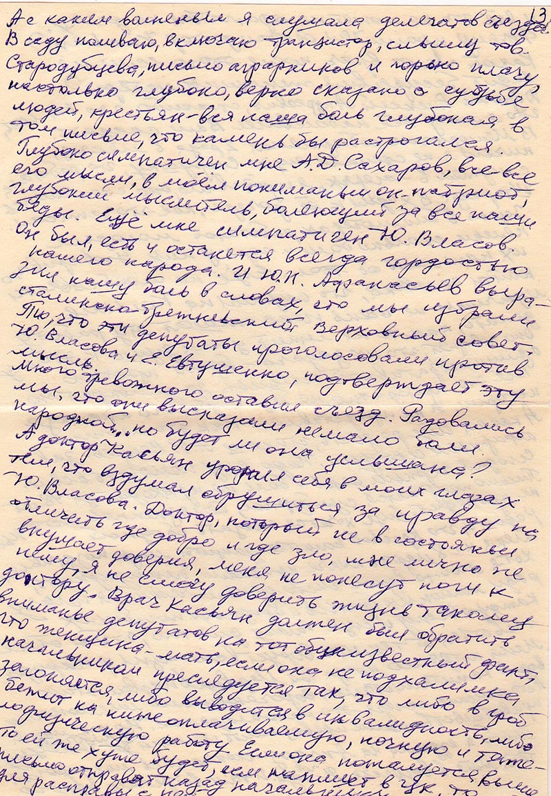 А с каким волненьем я слушала делегатов съезда. В саду поливаю, включаю транзистор, слышу тов. Стародубцева, письмо аграрников и горько плачу, настолько глубоко, верно сказано о судьбе людей, крестьян – вся наша боль глубокая в том письме, что камень бы растрогался.