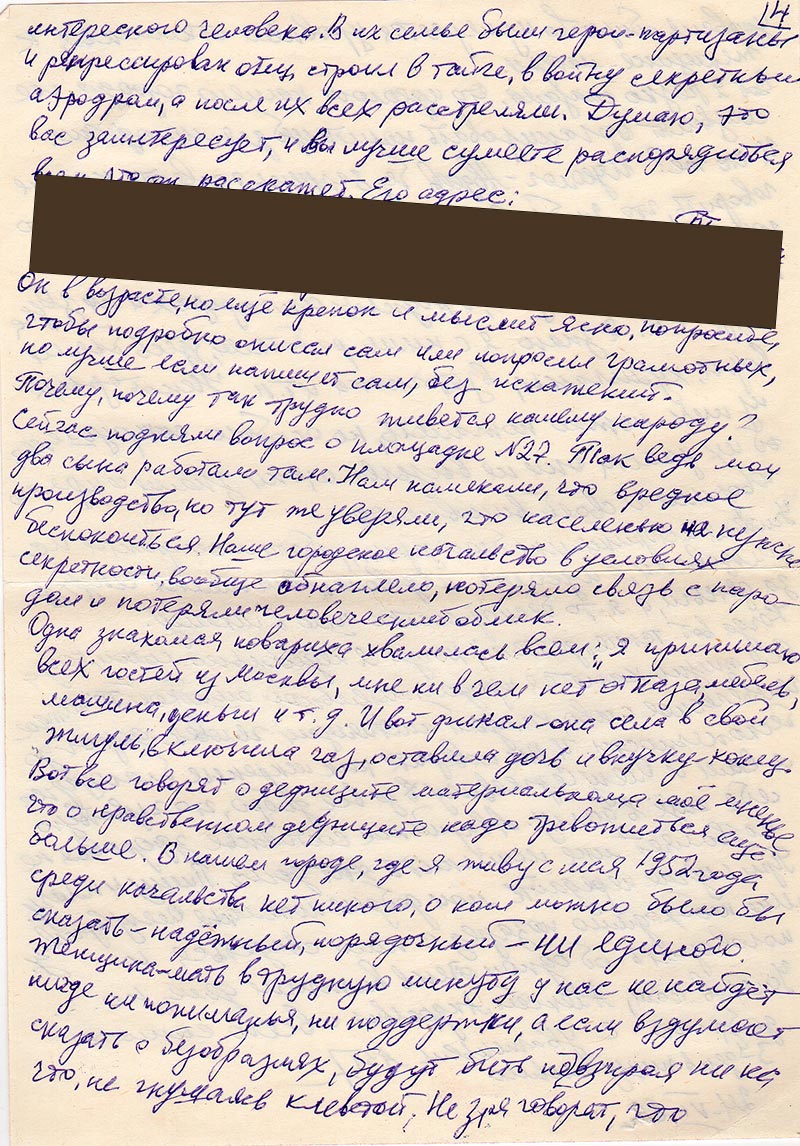 Сейчас подняли вопрос о площадке №27.Так ведь мои два сына работали. Нам намекали, что вредное производство, но тут уверяли, что населенью не нужно беспокоиться. Наше городское начальство в условиях секретности, вообще обнаглело, потеряло связь с народом и потеряли человеческий облик.